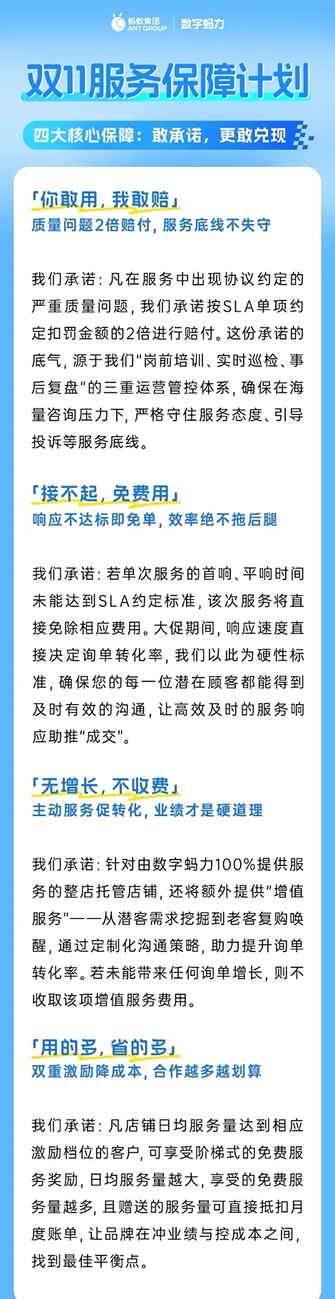 8 月 20 日消息,蚂蚁集团旗下数字蚂力公司正式发布“双 11 服务保障计划”,承诺“你敢用,我敢赔”、“接不起,免费用”、“无增长,不收费”、“用的多、省的多”,计划直击电商客服痛点,通过以效果付费的模式,用好的服务为品牌带来切实的商业增长。vivo、百丽、添可、小米、徕芬、珀莱雅(603605)、森马等十余个一线品牌首批加入该计划。