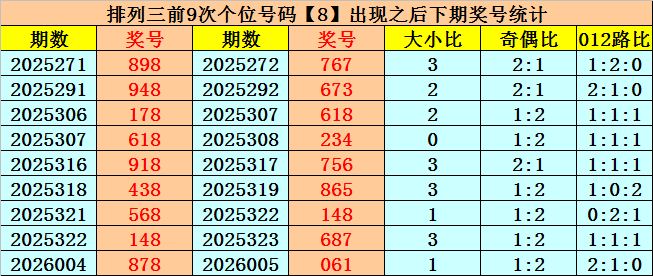 个位号码:上期奖号为大号、偶数、2路号码:8,历史上个位号码8共开出767期,前一次出现在第2026004期,上期遗漏1期再出。