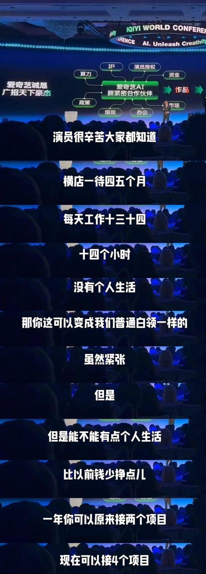 与此同时,爱奇艺CEO龚宇还偷换概念称,真人实拍的影视,未来可能被列为“非物质文化遗产”,但不会完全消失,同时他提到,以后演员靠着AI技术可将年产出量从4部提升至14部,虽然赚的少了,但是你有时间享受生活了,底下的观众听完他说的话,全都沉默了,